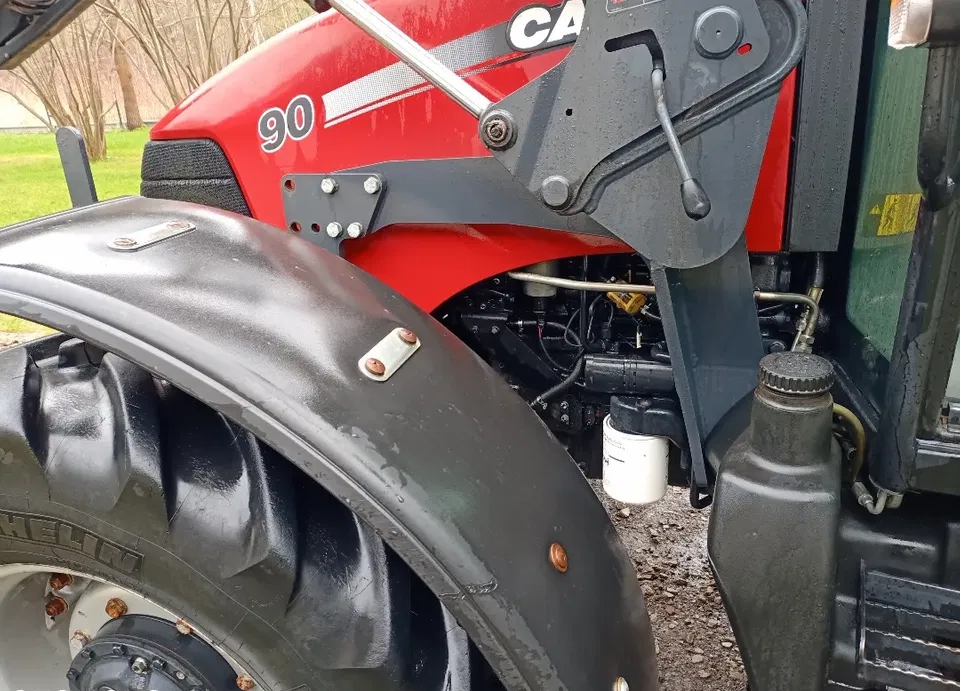 Case JX90 tractor – first owner, wide tires, wide fenders, wheel weights, beacon, air conditioning, radio, two-circuit pneumatic brake system + additional pneumatic supply, two hydraulic outputs + one hydraulic supply for power take-off and pump with the possibility of connecting an additional manifold, e.g. HDS, so-called free flow, original factory equipment. Book-book oil services at the factory service, after replacing the clutch disc at the factory service (mainly used to move pallets). Set with pallet forks, 2.2 m bucket, 2.5 m hydraulic snow plow, 3-section Stoll LRZ95 front loader + one hydraulic outlet